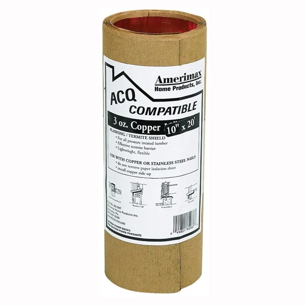 Conforms to any surface. ACQ compatible for all pressure-treated lumber. Effective termite barrier. 3 oz copper asphalt laminated to a sheet of creped Kraft paper reinforced with fiberglass scrim to meet government requirements, installed copper side up. Will not corrode or degrade like aluminum flashing. Used with copper or stainless steel nails.