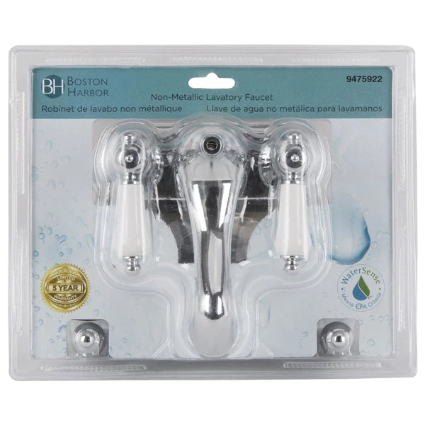 4 in centers. Dual acrylic lever handles and interchangeable chrome-plated ABS handles included, ABS construction, matching ABS pop-up, plastic waterways, washerless cartridge, 1/2-14 NPSM inlet. IAMPO & NSF certified. Carded.
